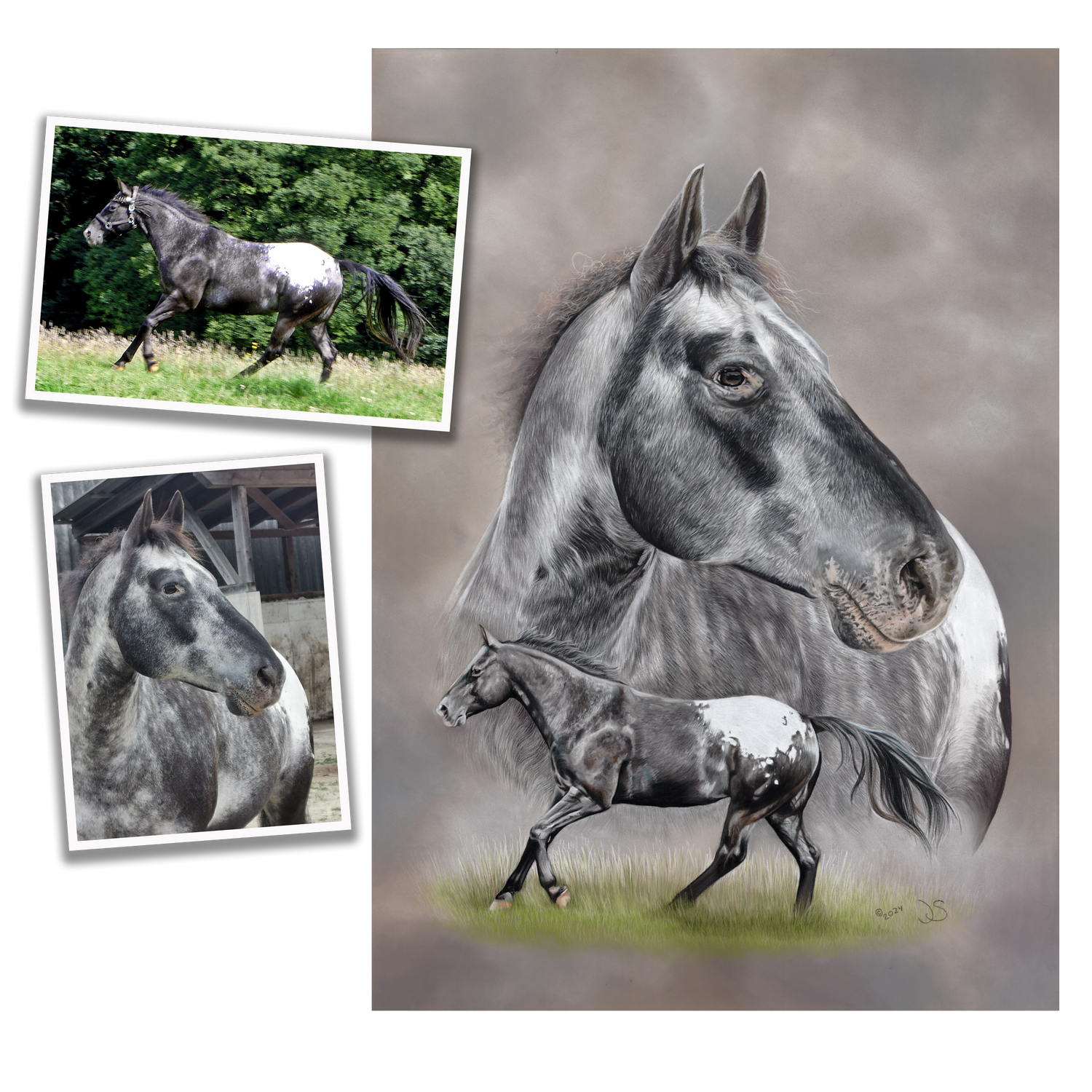 Um dir vorab einen ersten Eindruck zu möglichen Farben und Ausschnitten sowie Platzierungen von mehreren Tieren in einer Collage zu geben, bekommst du zuerst digitale Gestaltungsvorschläge. Nach der Zustimmung zu einem Entwurf beginne ich mit der Fertigung des Portraits.